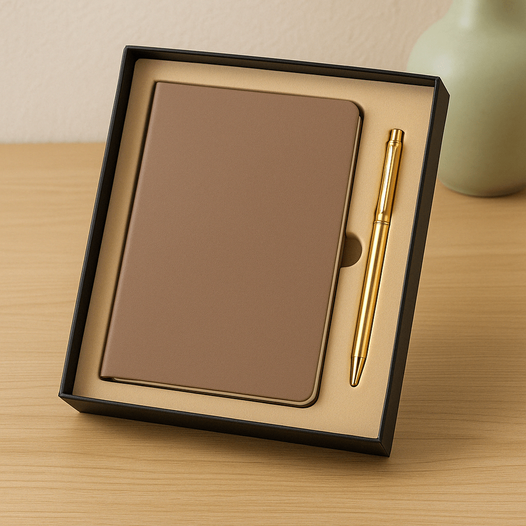 The notebook features smooth writing paper, premium covers (PU leather, fabric, or eco materials), and can be tailored in size, color, page layout, and logo placement. Paired with a sleek ballpoint or gel pen, both items are packed in a stylish box—ready for impactful presentation.